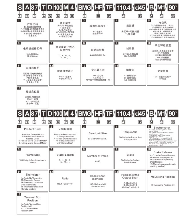 電動機極速:4-電動機極速為4,制動器:BMG-制動器,手動釋放裝置:HF-手動釋放、自動返回制動裝置。接線盒位置:圖中90°位置。